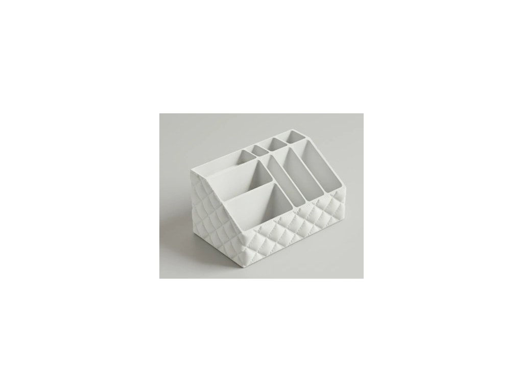 Organizér má sofistikovaný obdélníkový tvar (16 x 9 x 8 cm), jehož povrch zdobí plastický prošívaný vzor. Tento motiv připomíná jemné čalounění a působí luxusně i v těch nejjednodušších prostorech. Díky svému detailnímu zpracování a kvalitnímu materiálu je nejen funkční, ale také esteticky výrazný – dokonale se stane součástí Vašeho kosmetického stolku nebo koupelny.