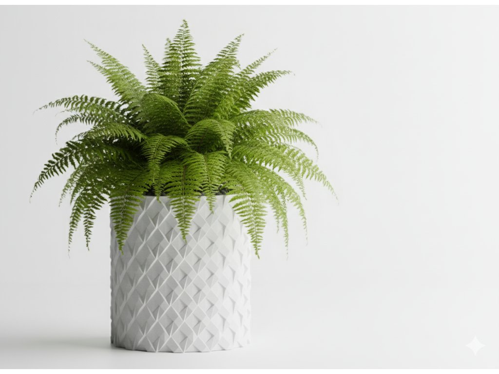 Tento designový květináč dokáže podtrhnout krásu každé rostliny. Zatímco geometrický vzor přitahuje pohledy, samotná rostlina zůstává stále v hlavní roli. Obzvlášť zajímavě působí v kombinaci s rostlinami s jemnějšími listy, například kapradinami nebo převislými druhy, které kontrastují s pravidelnou strukturou nádoby.